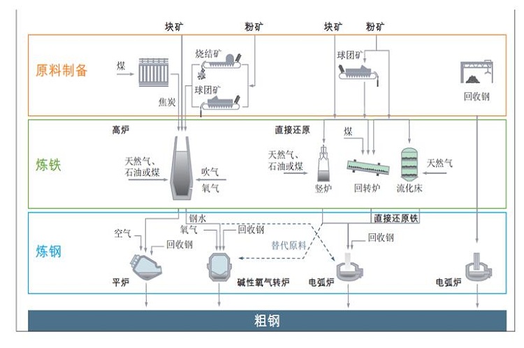目前兩大主要鋼鐵生產(chǎn)工藝:長(zhǎng)流程生產(chǎn)工藝以高爐和堿性氧氣轉(zhuǎn)爐為主,它們所用的原料包括鐵礦石、煤炭、石灰石和回收的廢鋼。該工藝生產(chǎn)一噸粗鋼平均使用1.4噸鐵礦石、0.8噸煤、0.3噸石灰石以及0.12噸廢鋼。電弧爐生產(chǎn)工藝主要使用回收的廢鋼及直接還原鐵和電。電弧爐工藝生產(chǎn)一噸粗鋼平均使用0.88噸廢鋼、16千克煤以及64千克石灰石。