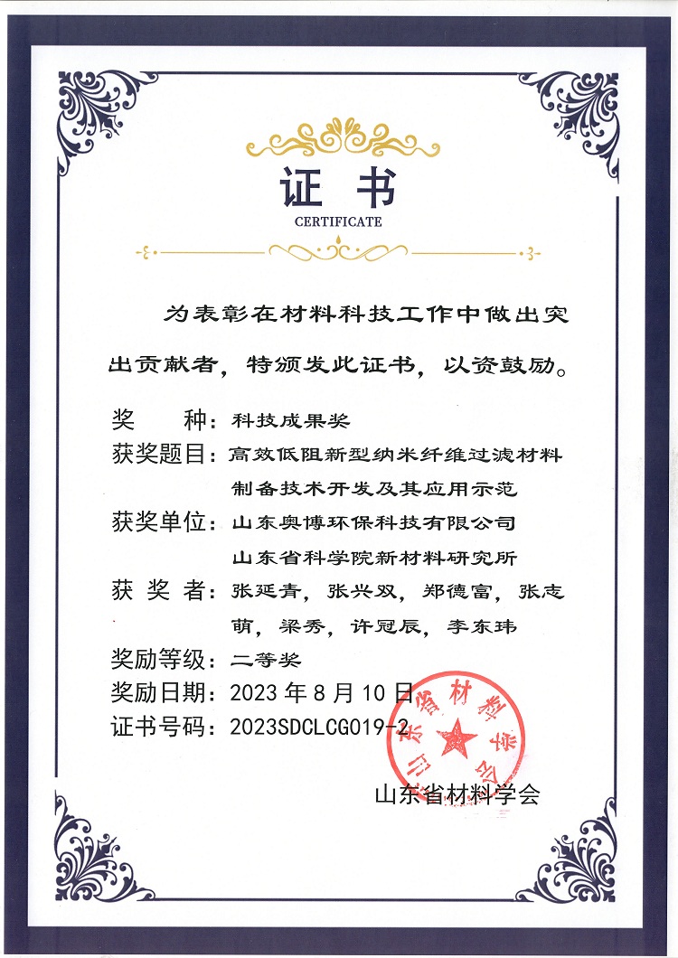 大會舉行的山東省材料科技成果頒獎儀式,由山東奧博環(huán)保科技有限公司與山東省科學院新材料研究所,共同研發(fā)的“高效低阻新型納米纖維過濾材料制備技術(shù)開發(fā)及其應(yīng)用示范”項目,以其優(yōu)秀的產(chǎn)品性能,廣泛的應(yīng)用領(lǐng)域及社會經(jīng)濟效益,榮獲二等獎!