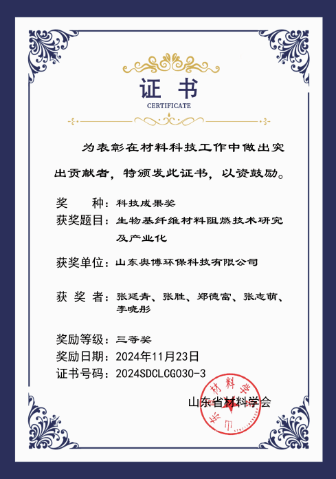 山東奧博環(huán)保的科研課題《生物基纖維材料阻燃技術(shù)研究及產(chǎn)業(yè)化》,榮獲此次山東省科技成果三等獎(jiǎng)!
